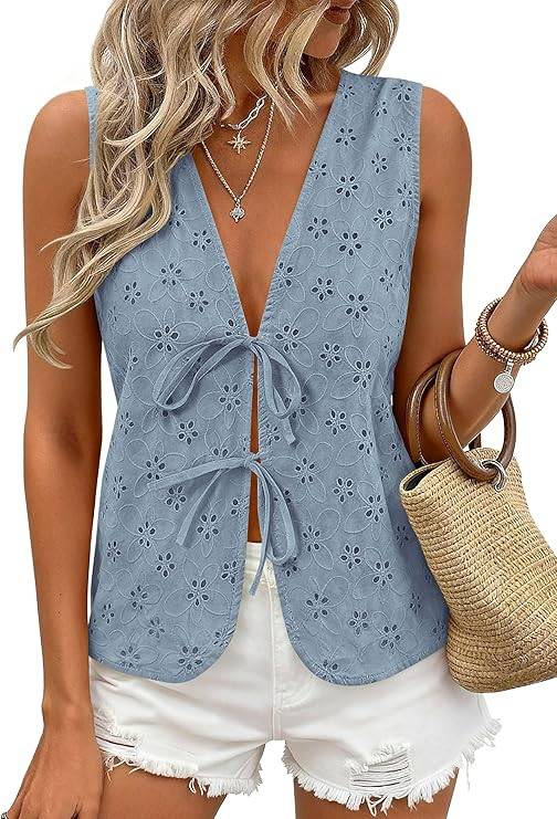1702 PRETTYGARDEN Women 2026 Summer Tie Front Eyelet Tank Tops